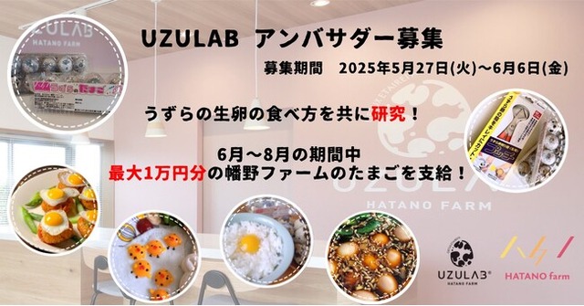 株式会社幡野ファーム(会社所在地:愛知県豊橋市、代表取締役:幡野 喜一)は、うずらの卵の需要低迷と養鶉業の衰退に立ち向かうため、この夏、新たな食の可能性を共に見出す“UZULAB(ウズラボ)アンバサダー”を募集します。夏季の7月8月は夏休みの学校給食の休止などの影響で、毎年うずら卵の不需要となり市場に大量のうずらのたまごが余ってしまいます。このことから、幡野ファームのうずらのたまごを使用した「熱い夏こそ、滋養強壮のうずらのたまごを食べよう」という新定番の料理をともに開発してくださる仲間を募ります。選ばれた方には、最大1万円分の幡野ファームのうずらの卵を支給します。清涼感あふれる夏向けレシピや、夏バテ対策レシピの発信で、うずらの卵の新たな魅力を創造しませんか?