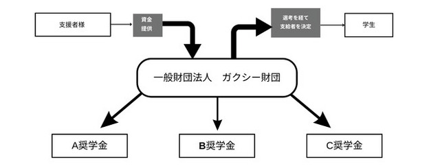 本スキームは、個人や法人の支援者が自らの想いを反映した奨学金制度を創設・運用できるよう、一般財団法人ガクシー財団が一括して支援・代行するモデルです。