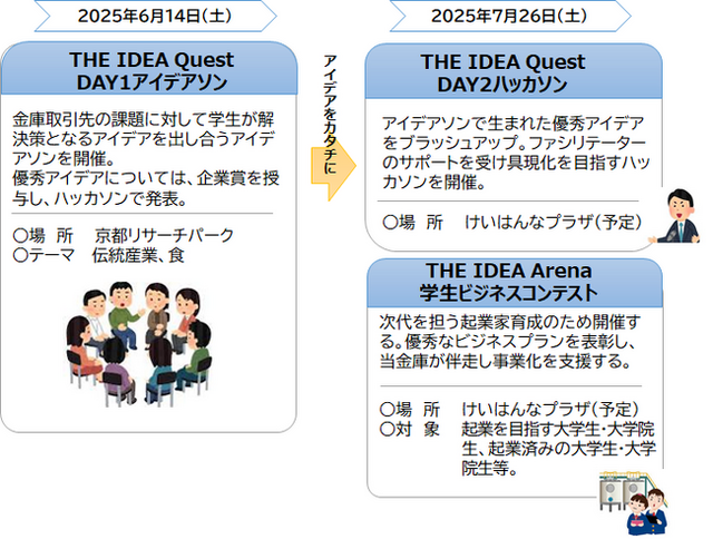 京都スタートアップ・エコシステム推進協議会の構成団体である、京都中央信用金庫(理事長 白波瀬 誠)は、京都府や各大学と連携し、次代を担う起業家の育成及びアントレプレナーシップの醸成を図る学生プログラム「IDEA BANK presented by 京都中央信用金庫」内のイベントとして、産学公が連携した「THE IDEA Quest」(アイデアソン・ハッカソン)及び「THE IDEA Arena」(学生ビジネスコンテスト)を下記の概要で開催しますので、お知らせします。