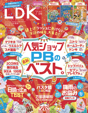 7月号は創刊12周年を記念して、「人気ショップ&PB 本っ当のベスト」を総力特集! テストして見つけた、安くていいものがこの一冊でまるっとわかります。また、梅雨地味ピンチ大回避術、電動アシスト自転車乗り比べなど、生活が楽しくなる情報が満載です。特別付録は「東京ディズニーランド&シー」と「ユニバーサル・スタジオ・ジャパン」のお得技ベストセレクション! 話題のエリアを楽しむ裏ワザを惜しみなく公開しちゃいます。「使う人目線」の検証で見つけた「本当にイイもの」で、心地よい暮らしを実現しましょう。