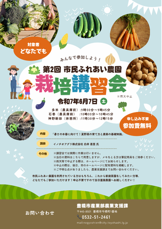 豊橋市は野菜や花などの栽培を通じて土に触れ合う楽しさを広めるとともに、農業への理解を深めたり、余暇を楽しむ健康づくりの場として活用してもらったりすることを目的に、市内3カ所で「市民ふれあい農園」を整備し、市民に向けて貸し出しています。利用者の中には初めて栽培をする人も多いため、年4回、その季節に合った野菜や花の栽培を楽しめるように講習会を実施し、今回の講習会もその一環で開催します。対象は市民ふれあい農園利用者に限らず、「家庭菜園をこれから始めてみたい」「市民ふれあい農園に興味がある」という人など、幅広く参加を呼びかけています。