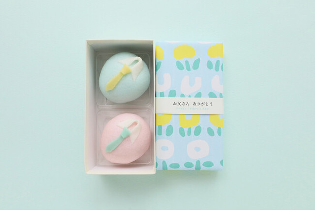 シャツとネクタイが愛らしい上用まんじゅうを、父の日カラーのお箱に詰めました。