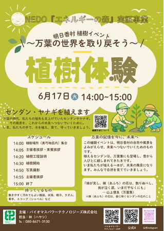 バイオマスパワーテクノロジーズ株式会社(三重県松阪市)は、来る6月17日に奈良県明日香村にて、NEDO「エネルギーの森」実証事業の一環として*1、地元中学校生を中心とする地元住民参加型で植樹イベントを開催します。