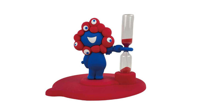 大阪・関西万博公式キャラクター「ミャクミャク」の「砂時計付きカップ麺ストッパー」が新登場!カップラーメンにお湯を入れたあと蓋の上に置いて砂時計にて約3分の時間が計れるよ!