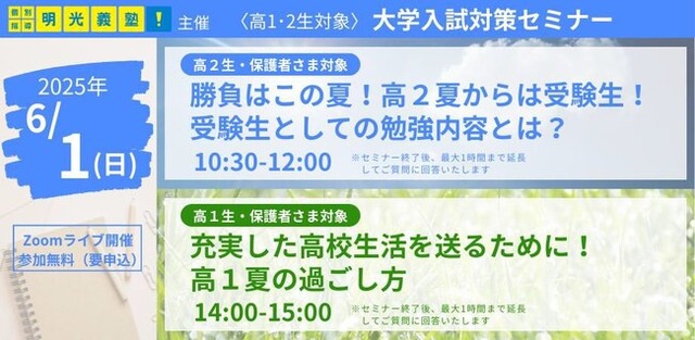 個別指導の「明光義塾」を全国展開する株式会社明光ネットワークジャパン(本社:東京都新宿区、代表取締役社長:岡本 光太郎)は、高1・2生とその保護者を対象に、大学入試の最新情報と夏の勉強のポイントについて解説するオンラインセミナーを開催いたします。