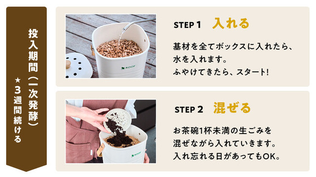 使い方はとてもシンプル。生ごみを、「入れる」「まぜる」「ふたをする」だけ。