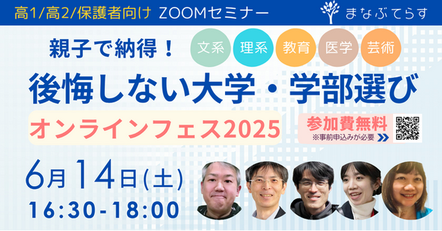 - タイトル: 『親子で納得!後悔しない大学・学部選びオンラインフェス2025』- 開催日時: 2025年6月14日(土)16:30~18:00(90分間)