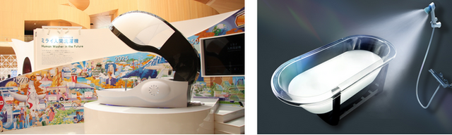 2025年大阪・関西万博の大阪ヘルスケアパビリオンに出展中の「ミライ人間洗濯機」は「カラダもココロも自動で洗われる時代へー」をコンセプトとしています。カラダを洗う部分では、ミラブルテクノロジーが活用されており、また、身をゆだねているだけで背面のセンサーを使用して入浴者の心電図をモニタリングし、よりリラックスやリフレッシュができる空間を演出。ミライの浴室環境における新習慣を提案しています。