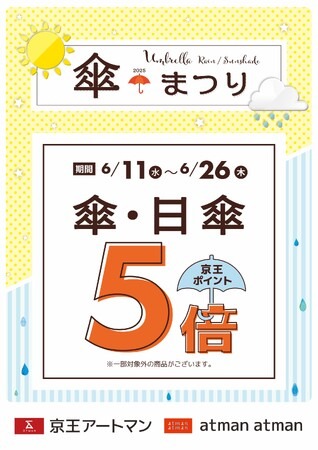 京王グループでコスメを中心に生活雑貨を販売する株式会社京王アートマン(本社:東京都多摩市、以下 京王アートマン)は、2025年6月11日(水)から2025年6月26日(木)まで京王アートマン・アートマン アートマンの対象店舗にて「傘・日傘 京王ポイント5倍」を開催いたします。