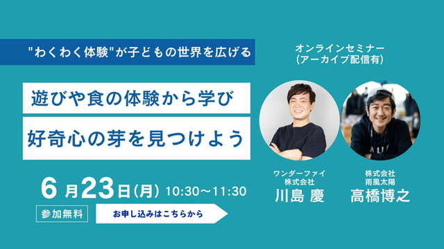 「都市と地方をかきまぜる」をミッションとする株式会社雨風太陽(本社:岩手県花巻市、代表取締役社長:高橋 博之、証券コード:5616、以下「当社」)とワンダーファイ株式会社(本社:東京都千代田区、代表取締役:川島 慶、以下「ワンダーファイ」)は、当社代表高橋博之とワンダーファイ代表川島慶氏のオンライン対談イベントを6月23日(月)に開催します。イベントでは、”子どもの好奇心”をテーマに、遊び・食・日常からはじまる知的好奇心の育み方を探ります。