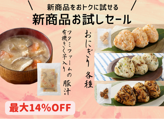 新登場した「おにぎり」とワタミファームのきく芋や無添加にこだわった有機味噌を使用した「豚汁」が今だけセール価格で同梱いただけます。