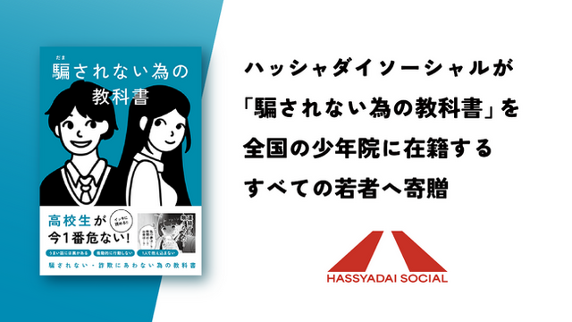 一般社団法人HASSYADAI social(以下、ハッシャダイソーシャル)は、法務省と連携し、若年層の詐欺被害・加害防止を目的とした教材『騙されない為の教科書』を、全国のすべての少年院・少年鑑別所に無償配布します。約6年間にわたり少年院でキャリア支援や価値観形成支援に取り組んできた経験をもとに、SNSの普及や成人年齢引き下げなどによって増加している詐欺被害および加害に巻き込まれるケースから若者たちを守るための取り組みです。ハッシャダイソーシャルは今後も少年院や少年鑑別所での教育プログラムを拡大し、若者たちの更生と自立を支援していきます。