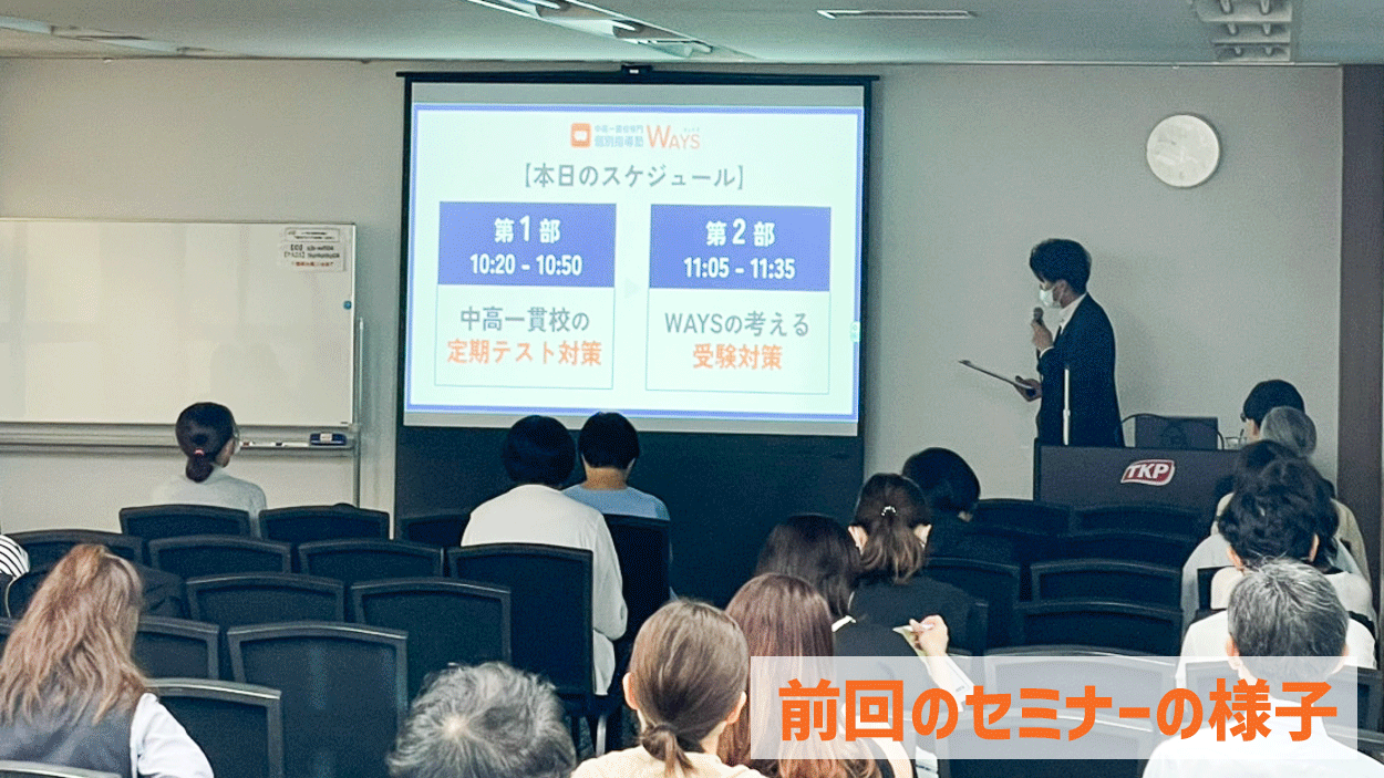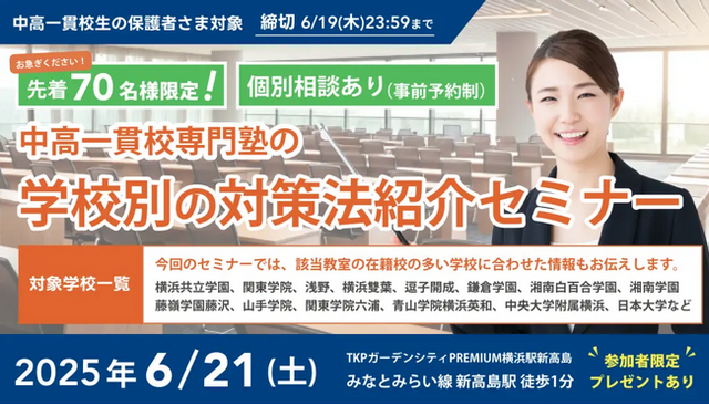 株式会社メイツ(本社:東京都新宿区 代表取締役:遠藤尚範)が運営する『中高一貫校専門 個別指導塾WAYS(以下、WAYS)』では2025年6月21日(土)に横浜にて、中高一貫校に通う生徒・保護者さまを対象とした、学校別の対策法紹介セミナーを開催いたします。