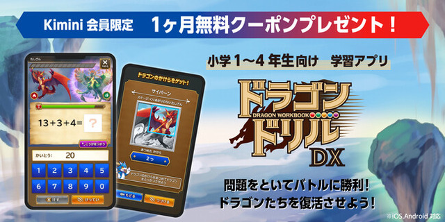 株式会社 学研ホールディングス(東京・品川/代表取締役社長:宮原博昭)のグループ会社で、オンライン英会話サービス「Kimini英会話」を提供している株式会社 Glats(東京・品川/代表取締役社長:杉原聡)は、2025年6月3日(火)より会員向けに、シリーズ累計発行部数100万部突破の大人気ドリル「ドラゴンドリル」の学習アプリ「学研ドラゴンドリル 算数/国語の学習アプリで学ぼう!」が1ヶ月無料で利用できるコラボクーポンプレゼントキャンペーンを開始いたしました。