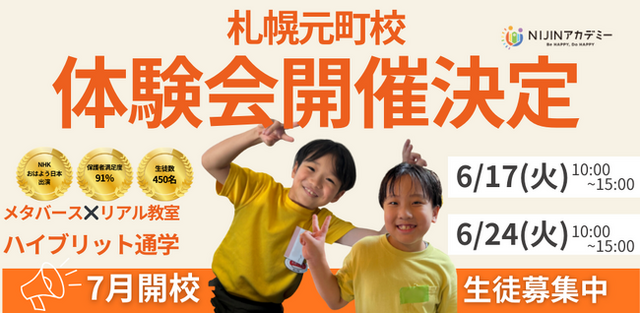 株式会社NIJIN(本社:東京都江東区、代表取締役:星野達郎)が運営する不登校オルタナティブスクール『NIJINアカデミー』は、メタバースとリアルを掛け合わせたハイブリッド通学「NIJINアカデミー札幌元町校」にてリアル教室体験会を開催することをお知らせいたします。