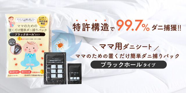 フェムケア・フェムテック分野を中心に、主に女性向け商品を企画・販売する株式会社あしたるんるんラボはダニの閉じ込め率99.7%(※1)の特許構造を採用した、「ママのための置くだけ簡単ダニ捕りパック ブラックホール(R)︎タイプ」を6月12日(木)に発売いたします。