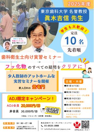 株式会社オール・デンタル・ジャパン【ADJ】(代表取締役:木下英明・廣田祥司)はDH向けハンズオンセミナーを、2025年7月6日(日)に都内のクリニックにて開催致します。