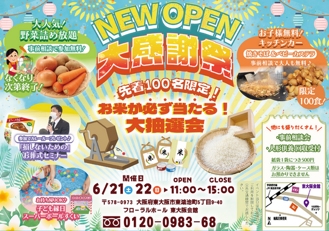 株式会社 家族葬のフローラルホールは、2025年6月に新たにオープンする「フローラルホール 東大阪会館」(東大阪市東鴻池町)にて、地域の皆さまへの感謝を込めたグランドオープンイベント「大感謝祭」を2025年6月21日(土)・22日(日)の2日間にわたり開催いたします。
