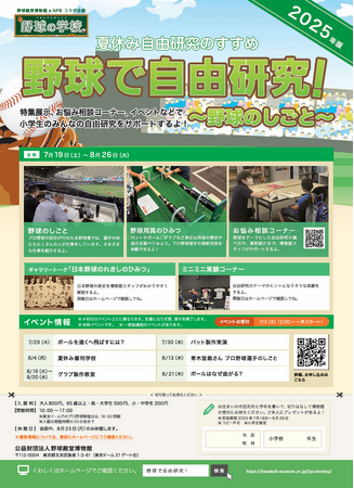 野球殿堂博物館では、夏休み期間に小学生のみなさんの自由研究を応援する恒例企画「野球で自由研究!」を開催します。今年は「野球のしごと」をテーマとした展示やイベントも実施予定です。