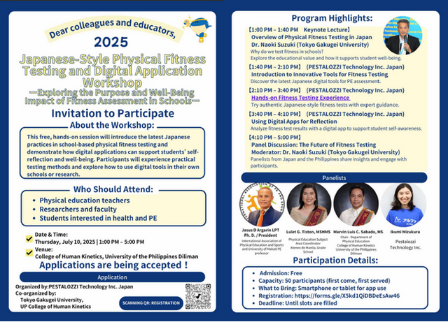 This free, hands-on session will introduce the latest Japanese practices in school-based physical fitness testing and demonstrate how digital applications can support students’ self-reflection and well-being. Participants will experience practical testing methods and explore how to use digital tools in their own schools or research.