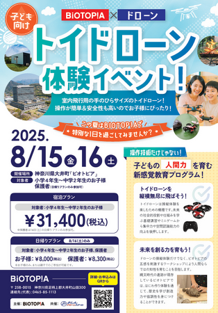 ビオトピアを運営する株式会社ブルックスホールディングス(※1本社:神奈川県横浜市青葉区美しが丘4-54-6、代表取締役:小川裕子)及び株式会社おしんドリーム(※2)は2025年8月15日(金)・16(土)に【トイドローン体験イベント~「未病×ドローン」で子どもたちの「未来を創る力」を育む~】を実施します。