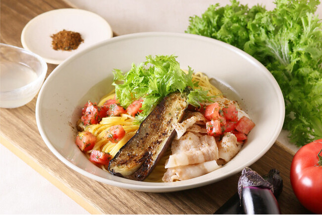 焼きなすの香ばしさと、大葉風味のトマトマリネの爽やかさ。やわらかな豚しゃぶを、塩ポン酢と出汁でやさしくまとめた夏の和パスタです。仕上げのわさび菜の風味と、山椒をきかせたオリジナルスパイスがほんのりアクセント。季節の恵みが、すっとからだになじむ味わいをお愉しみください。
