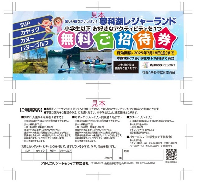 各自治体のご協力のもと、茅野市・諏訪市・岡谷市・下諏訪町・富士見町・原村の小学生へ招待券を配布し、蓼科湖レジャーランドのアクティビティを無料で体験いただける機会を提供いたします。