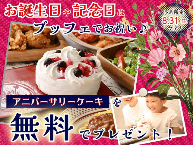 そこで、グランブッフェでは、通常500円(税込550円)の「アニバーサリーケーキ」を、2025年6月19日(木)~ 2025年8月31日(日)の期間、ご予約限定にて『無料』でプレゼントいたします!