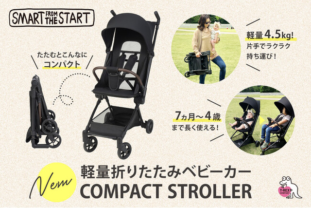株式会社ティーレックス(本社:大阪市中央区)はオリジナルブランドの「Smart from the Start」よりコンパクトストローラーを発売します。特徴は軽量4.5kgと三つ折りに畳めるコンパクトサイズ。ハンドルのロックを操作して座面を倒せば10秒で折り畳みが可能となっている。7か月から4歳まで長く使用ができる実用的なベビーカー。ベビーザらス限定モデルとして6月中旬発売。
