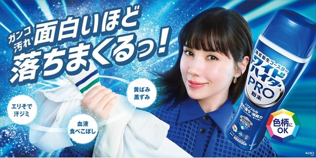 CMでは仲里依紗さんが、新しい『ワイドハイターPRO 粉末』のちょい足しやつけおき洗いで、困った汚れが一発でパワフル落ちすることをお伝えしています。