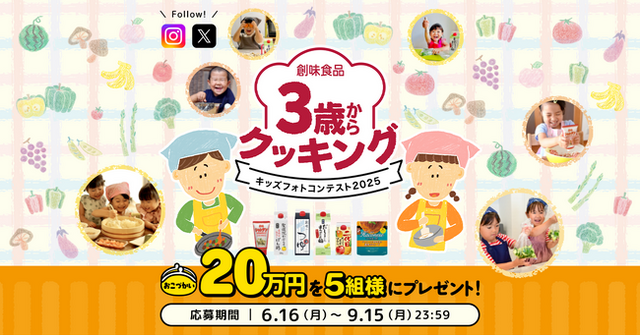 株式会社 創味食品(所在地:京都府京都市)は本年も、「3歳からクッキング フォトコンテスト2025」を実施します。本企画は2021年から毎年開催しており、「お子様の料理をもっと応援したい」、「より身近に料理に触れ合う機会を」という想いから生まれたSNS写真投稿キャンペーン企画です。