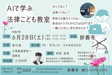 株式会社DDR(本社:東京都港区虎ノ門、代表取締役社長兼執行役員CEO的場令紋)は、2025年6月28日(土)に、小中高生を対象とした教育イベント『AIで学ぶ法律こども教室』を開催いたします。
