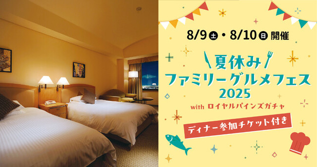 ソラーレ ホテルズ アンド リゾーツ株式会社(所在地:東京都港区、代表取締役社長:井 上 理)が運営するロイヤルパインズホテル浦和は、8月9日(土)・10日(日)に開催される「夏休みファミリーグルメフェス2025with ロイヤルパインズガチャ」のディナーチケット付き宿泊プランを2025年6月17日(火)15:00~販売開始いたします。8/9・10泊の各日10室限定販売。翌朝食も付いたお得な宿泊プランとなっております。夏休みファミリーグルメフェスではホテル自慢のビュッフェディナーをお召し上がりいただきながら、マグロ解体ショーやライブキッチン、キッズシェフ体験、宿泊券やレストランお食事券などが当たるガチャをお楽しみいただけます。夏休みのグルメイベントとしていかがでしょうか?皆様のお越しをお待ちしております。