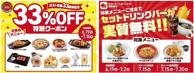 株式会社すかいらーくレストランツ(本社・東京都武蔵野市、代表取締役社長 中島 尚志)が運営するガストでは、2025年6月19日(木)より、生誕33周年を記念した「33%OFF特別クーポンの配信」、「すかいらーくポイント還元キャンペーン」の2大特典キャンペーンを開催いたします。