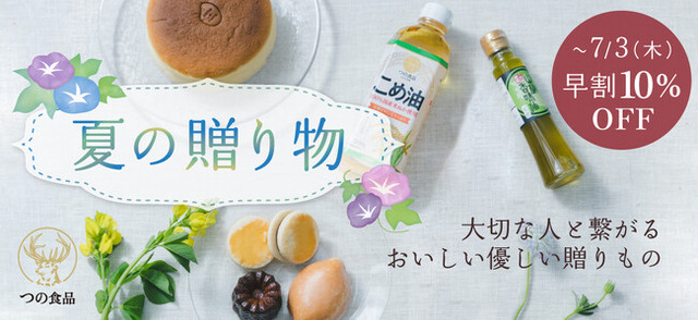 「お米の油は、つの食品。」築野食品工業株式会社(本社:和歌山県伊都郡かつらぎ町、代表取締役社長:築野富美)オンラインショップでは、人気の国産こめ油や米粉スイーツギフトを、お中元早割期間7/3(木)までの限定【10%OFF】にて受付中です。こだわりの素材で仕上げた、身体にやさしい夏の贈り物。ご家族やご友人への季節のごあいさつに、ぜひご利用ください。