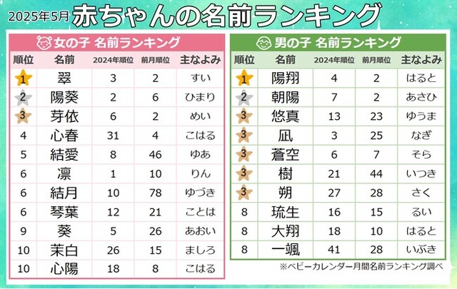 2025年5月生まれ 人気の名前ランキング|ベビーカレンダー月間名前ランキング調べ
