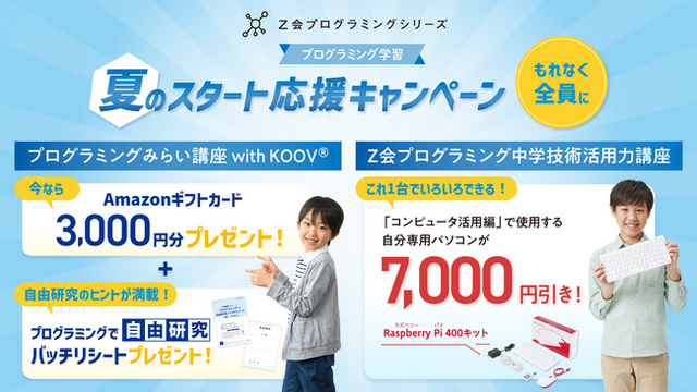 株式会社増進会ホールディングス(Z会グループ)のグループ会社である株式会社Z会は、自宅で学べる「Z会プログラミングシリーズ」の対象講座をお申し込みいただくと、Amazonギフトカードプレゼントや、自由研究に役立つ「プログラミングで自由研究バッチリシート」プレゼント、また、キットをお得に購入できる特典が受けられるキャンペーンを、6/12~7/31の期間限定で実施中です。