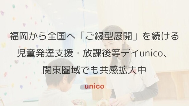 「子どもたちの可能性を解放する」をミッションに掲げ、児童発達支援・放課後等デイサービスなどの児童福祉事業を手掛ける株式会社unico(代表:濱田 諒、以下「unico」)は、福岡地域にて児童発達支援・放課後等デイを10年間運営してきたノウハウ及び開発と実践を重ねてきた療育メソッドをベースに、「unicoを利用したい」という利用者様の声、「unicoを運営したい」という法人様の声をもとにその地域の方々とのご縁ありきで教室を開設していく「ご縁型展開」にて、全国各地にunicoの教室を拡大してまいりました。今年度2025年は関東圏域でご縁が重なり、既に関東圏にて3教室の開設が決定しております。