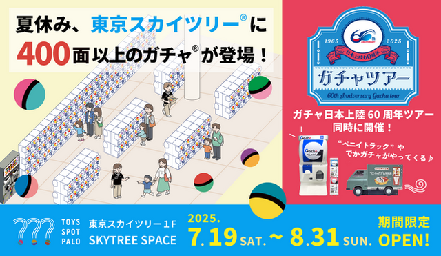 株式会社イオンファンタジー(本社:千葉県千葉市、代表取締役社長:藤原徳也、以下イオンファンタジー)は、東京スカイツリー1階 SKYTREE SPACEにて、7月19日(土)~8月31日(日)の夏休み期間限定でカプセルトイ専門店「TOYS SPOT PALO」(トイズスポットパロ、以下同店)をオープンいたします。タカラトミーグループの株式会社ペニイ(東京都葛飾区/代表取締役社長 佐藤正臣、以下ペニイ)と、株式会社タカラトミーアーツ(東京都葛飾区/代表取締役社長 近藤歳久、以下タカラトミーアーツ)は同店内で「ガチャ日本上陸60周年ツアー」を展開いたします。