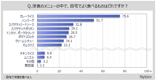 自宅で洋食を食べる人に、よく食べるメニューを聞いたところ(複数回答)、「カレーライス」が75.6%で最も多く、「ハンバーグ」が51.7%、「スパゲティミートソース」が32.8%で続きます。