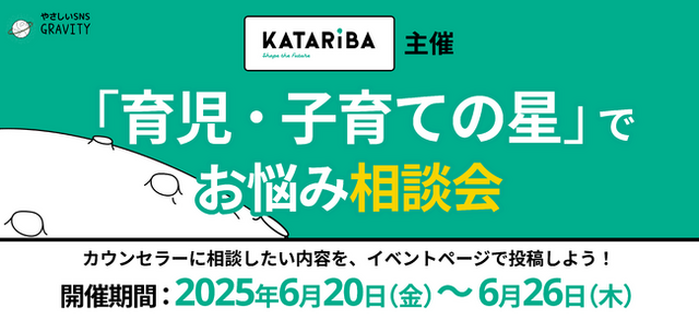 HiClub株式会社(本社:東京都港区、代表取締役社長:古谷由宇)が提供する、やさしいSNS「GRAVITY(グラビティ)(以下グラビティ)」(iOS、Android版)は、より生きやすい、過ごしやすいSNSにしていく取り組みとして、どんな環境に生まれ育った10代も未来を自らつくりだす意欲と創造性を育める社会を目指し、2001年から活動する認定NPO法人カタリバ(本部所在地:東京都中野区、代表理事:今村久美、以下カタリバ)と共同で、グラビティアプリ内にて相談/質問会イベントを2025年6月20日(金)~26日(木)まで開催しますことをお知らせいたします。本イベントは、グラビティアプリ内コミュニティ「育児・子育ての星」内「質問ひろば」内で行われ、テキスト投稿形式にて行われます。
