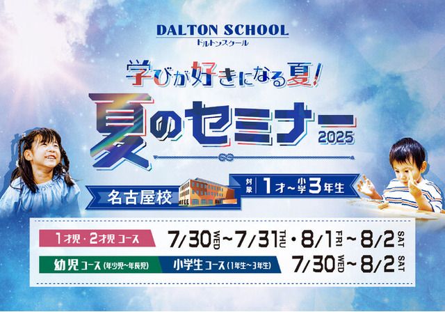 幼児・児童教育を行う河合塾グループのドルトンスクール名古屋校は、1才児~小学3年生を対象にした夏のセミナーを7月30日(水)~8月2日(土)に開催します。学齢、学年に応じて設けたテーマのもと、創作活動や探究活動に取り組みます。1才児・2才児は保護者の方と共にご参加いただきながら、子どもの知的好奇心を喚起する独自のプログラムで「学びが好きになる夏」を体感できます。