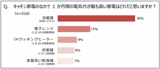 『夏の家事に関する調査』によると、キッチン家電の中で1か月あたりの電気代が最も高いと考えられているのは「冷蔵庫」で、約4割の人が「最も電気代がかかるキッチン家電」として挙げました。