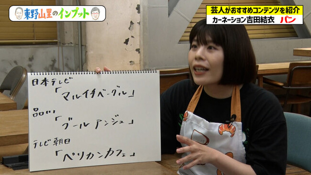 また、今回は、「東野と山里が足を運びやすい現場周りでおすすめのお店」を紹介。店舗の情報はもちろん、おすすめメニューもプレゼンします。あるお店のベーグルを紹介した際には、東野が「山ちゃんが『DayDay.』本番前に(おしゃれな)ベーグルを食べているのを(スタッフに)見られたら悪口言われへん?」と懸念。山里も「クスクス笑われそうじゃない?」、「そのハードルを超えられるか……緊張しています」と言うも、吉田は「堂々といてほしいです!」と強くおすすめします。