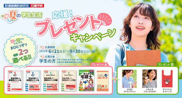 資格取得支援スクールの日建学院を運営する株式会社建築資料研究社(所在地:東京都豊島区、代表取締役社長:馬場栄一)は、2025年現在、大学・大学院・短期大学、高等専門学校、専門学校、工業高校・各種学校(職業訓練校等)に在籍している学生を対象に、お申込いただいた方にもれなく学生生活や資格学習に役立つ品物をプレゼントする「夏の学生生活応援!プレゼントキャンペーン」を2025年9月30日(火)まで実施いたします。