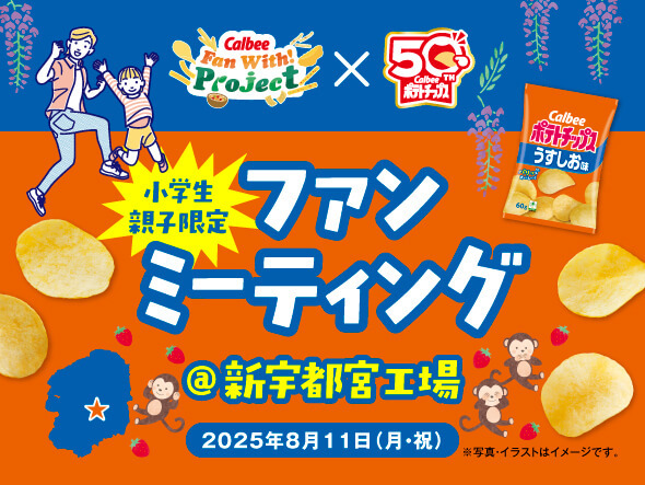 栃木県宇都宮市の新宇都宮工場でポテトチップス発売50周年を記念した小学生親子限定のファンミーティングを2025年8月11日(月・祝)に開催します。製造工程の実況中継やできたて商品の試食など親子で楽しめる体験プログラムをご用意しております。応募の締め切りは6月26日(木)23:59です。