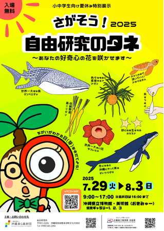 一般財団法人 沖縄美ら島財団は、2025年7月29日(火)から8月3日(日)まで、沖縄県立博物館・美術館(おきみゅー)にて、夏休み特別展示「さがそう!自由研究のタネ~あなたの好奇心の花を咲かせます~」を開催いたします。本展示では、沖縄の海や陸の生きもの、歴史文化の「ふしぎ」や「魅力」をパネルや標本を通じて紹介します。また、専門家や研究者と直接対話できる「ゆんたくブース」も設け、子どもたちの自由研究をサポートします。
