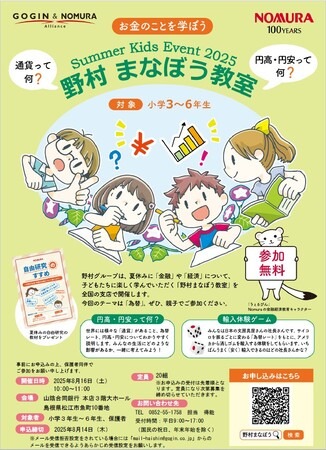 ごうぎんは、野村グループ※と共催で、小学3年生から6年生を対象とした「Summer Kids Event 2025 野村まなぼう教室」を開催しますので、お知らせいたします。なお、当行が本イベントを開催するのは今年で2回目です。