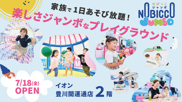 株式会社イオンファンタジー(本社:千葉県千葉市、代表取締役社長:藤原徳也、以下、当社)は、2025年7月18日(金)、新モデルの1日滞在型こどもの遊び場「のびっこジャンボ」の2号店目として、「のびっこジャンボ 豊川開運通店」を愛知県豊川市にオープンいたします。この施設は、0歳から12歳までの子どもとそのファミリーを対象とした、家族みんなが一日中笑顔で過ごせる屋内型プレイグラウンドです。