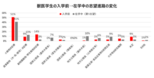 2010年代以降、獣医学生の進路の志望傾向は入学前では、いわゆる「動物のお医者さん」を志して獣医学部へ入学していますが、学年が進むにつれて少しずつ志望分野は変化していきます。